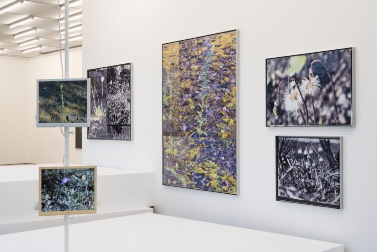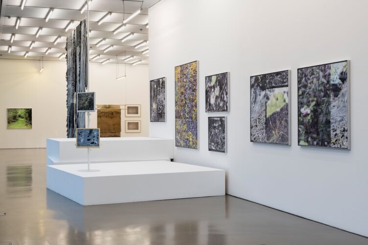Der Camera Austria-Ausstellungsraum im Eisernen Haus bildet den Rahmen für Hey Monte Schlacko, dear Slagorg (seit 2024): In der kontaminierten und ausgebeuteten Landschaft einer ruhenden Erzabbaustätte stehen Moose und Flechten mit anderen Pflanzen im Austausch, sie regenerieren die Böden, daneben Gestein; in der Szenografie hallen die Erschöpfung, die Widerständigkeit und das Trauma dieser anthropozentrischen Geografien nach. Diese jüngste Arbeit steht mit Susanne Kriemanns langjähriger forschender Arbeitsweise im Dialog, welche die Vegetation der von Uranabbau zurückgelassenen Landschaften in den Blick rückt: Die diese toxischen Böden verstoffwechselnden Pflanzen bringen Farbe auf die Seidenbahnen von Canopy canopy (seit 2018); Wilde Möhre, Falsche Kamille, Bitterkraut (seit 2016) tummeln sich in und auf Heliogravüren; die radioaktiv strahlende Pechblende (seit 2015) belichtet Autoradiografien und Fotogramme; Röntgenbilder zeigen Pflanzenskelette von Lupine, Farn und Ginster (Lupin, fougère, genêt, seit 2024). Die »library for radioactive afterlife« (seit 2015) bietet Publikationen mit unterschiedlichen Narrationen des Atomzeitalters an, erweitert die Camera Austria-Bibliothek und unterstreicht Susanne Kriemanns Praxis des Büchermachens.