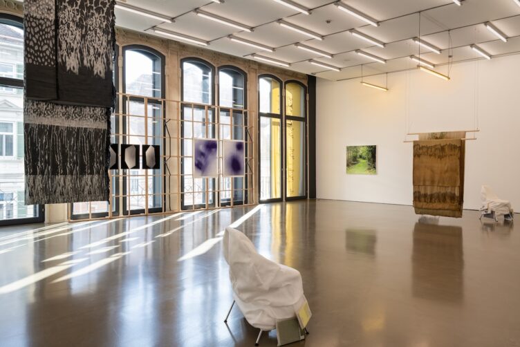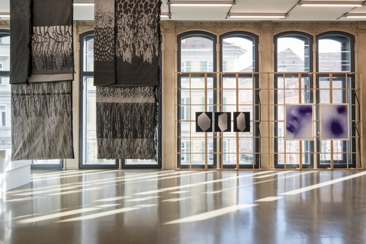 Camera Austria’s exhibition space in the Eisernes Haus (Iron House) forms the backdrop for the project Hey Monte Schlacko, dear Slagorg (since 2024). In the contaminated, exploited landscape of a vacant site for mining ore, there are mosses and lichens interacting with other plants, regenerating the soils alongside rocks; echoing in the scenography is the exhaustion, resistance, and trauma of these anthropocentric geographies. This most recent work dialogues with Susanne Kriemann’s long-term research approach, which focuses on the vegetation of landscapes that uranium mining has left behind: the plants metabolizing these toxic soils bring color to the silk panels of Canopy canopy (since 2018); Wild Carrot, False Chamomile, Ox Tongue (since 2016) romp through heliogravures; the radioactive Pitchblende (since 2015) exposes autoradiographs and photograms; and X-ray images show skeletons of plants like lupine, fern, and gorse bush (Lupin, fougère, genêt, since 2024). The “library for radioactive afterlife” (since 2015) offers publications with different narratives from the Atomic Age, and it expands Camera Austria’s library while also underscoring Susanne Kriemann’s book-making practice.